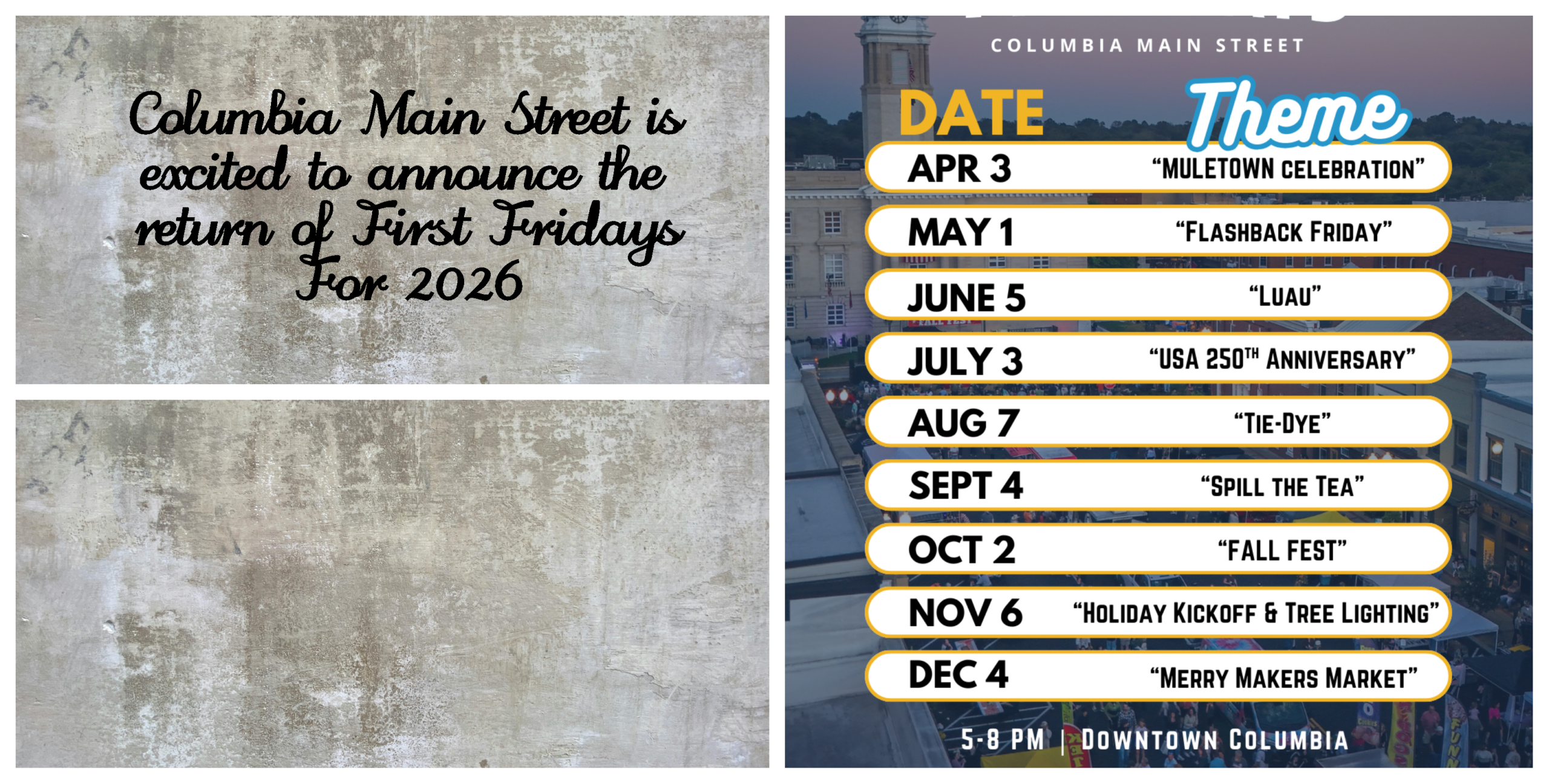 “It’s an honor to continue this beloved community event where residents can gather to enjoy great shopping, food, and a lively downtown atmosphere,” said Kelli Johnson, Columbia Main Street Director. “We encourage everyone to attend all nine First Fridays because each one will be different. Our goal is to help our residents deepen their love for our community by continuing to showcase the best that Columbia has to offer!”