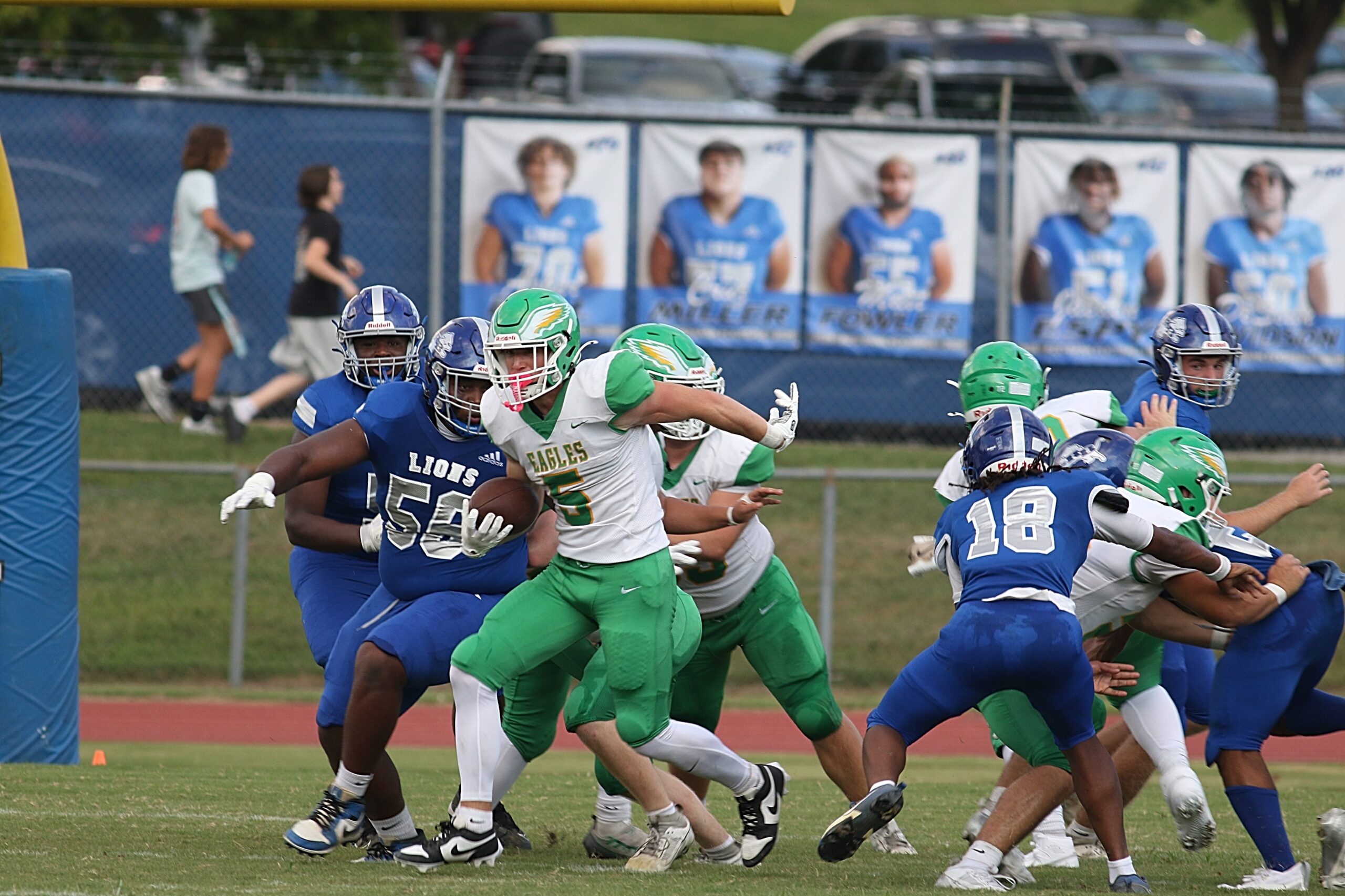 Mason Ford began the second series for the Eagles with some hard running and had the Eagles at the 20 yard line before some miscues by the Eagles stopped the drive, forcing a punt from the 17 yard line, there were some nervous moments as quarterback Jaxton Schmitt was chased into the end zone before he threw the ball away to prevent the safety after a high snap sailed over his head.